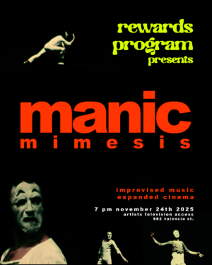 A three-projector celluloid meditation live-scored by improvisational trio Rewards Program, on charade, mimesis, and masquerade. Visuals in special collaboration with musician and artist Katia Mashikian. MILES LASSI is an interdisciplinary artist based out of Oakland, CA. As a musician, he has performed in over 150 cities throughout North America, Europe and Asia with many different ensembles ranging from the… Read more »